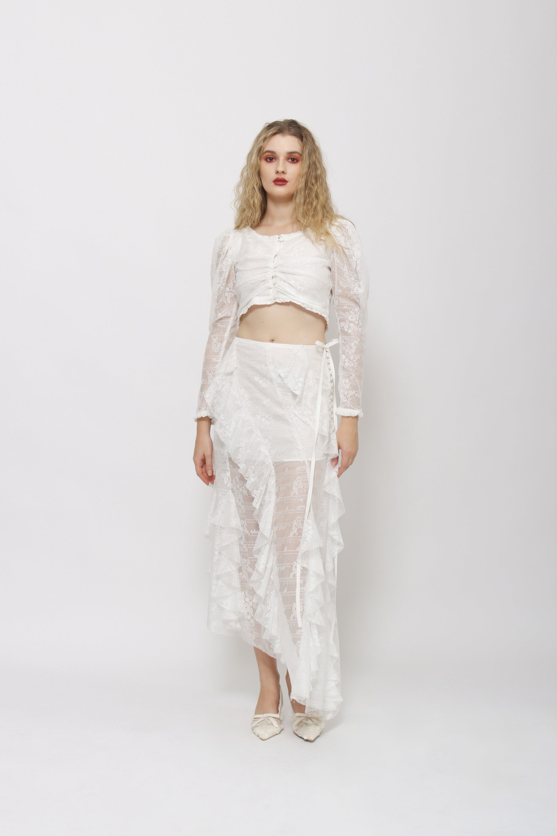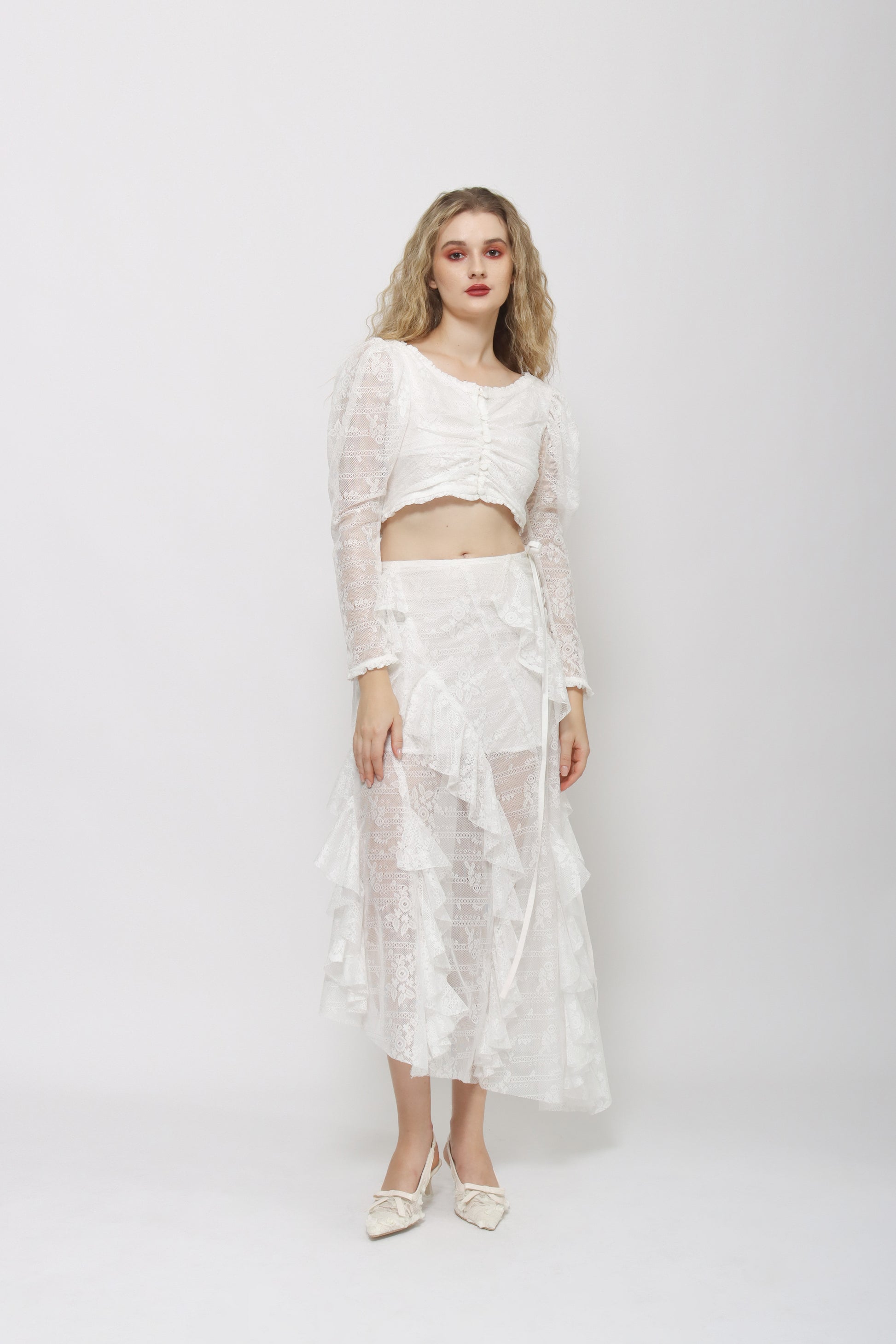 - Lace details on neckline and hem